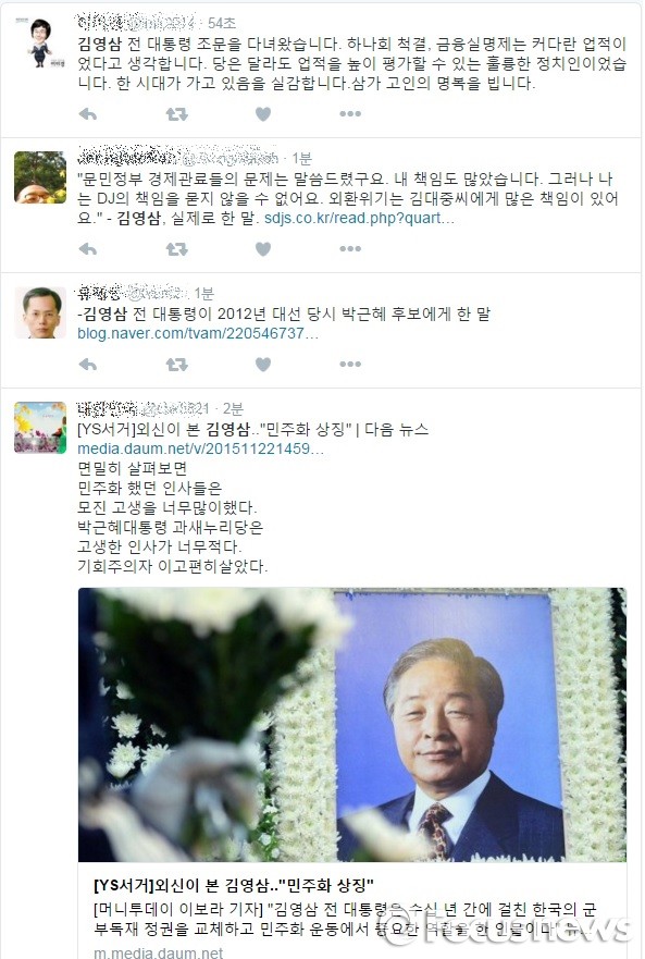 | △ 김영삼 전 대통령 소거 소식에 대한 갑론을박이 이어지고 있는 트위터 캡처. |