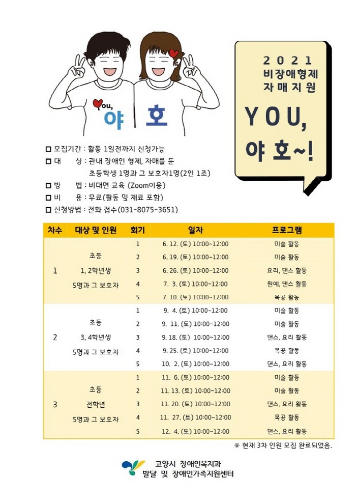 [부자동네타임즈 김인수기자] 고양시가 관내 장애인 형제, 자매를 둔 비장애 아동을 대상으로 비장애 형제, 자매지원 프로그램 ‘You, 야호~!’를 12월 4일까지 비대면으로 운영한다.