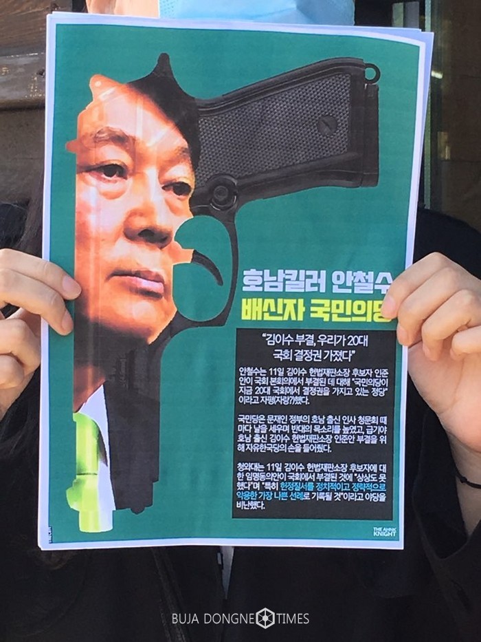 이어 안 대표가 이날 오후 전북 완주 용진 농협 현장을 방문했으나 여기에서도 일부 주민들이 항의 시위를 벌였다. 30대로 보이는 여성 2명은 마스크를 쓴 채 '호남 킬러 안철수 배신자 국민의당'이라는 전단을 들고 시위했다.