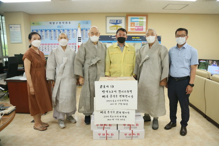 이날 고양시 불교사암연합회는 “코로나19 일일 신규 확진자 수가 3주 연속 네 자릿수를 기록하고 있는 가운데, 무더위 속에서도 지치지 않고 방역을 위해 애쓰는 공무원 및 관계자들을 응원하기 위해 들렀다”며 나눔의 뜻을 전했다.
