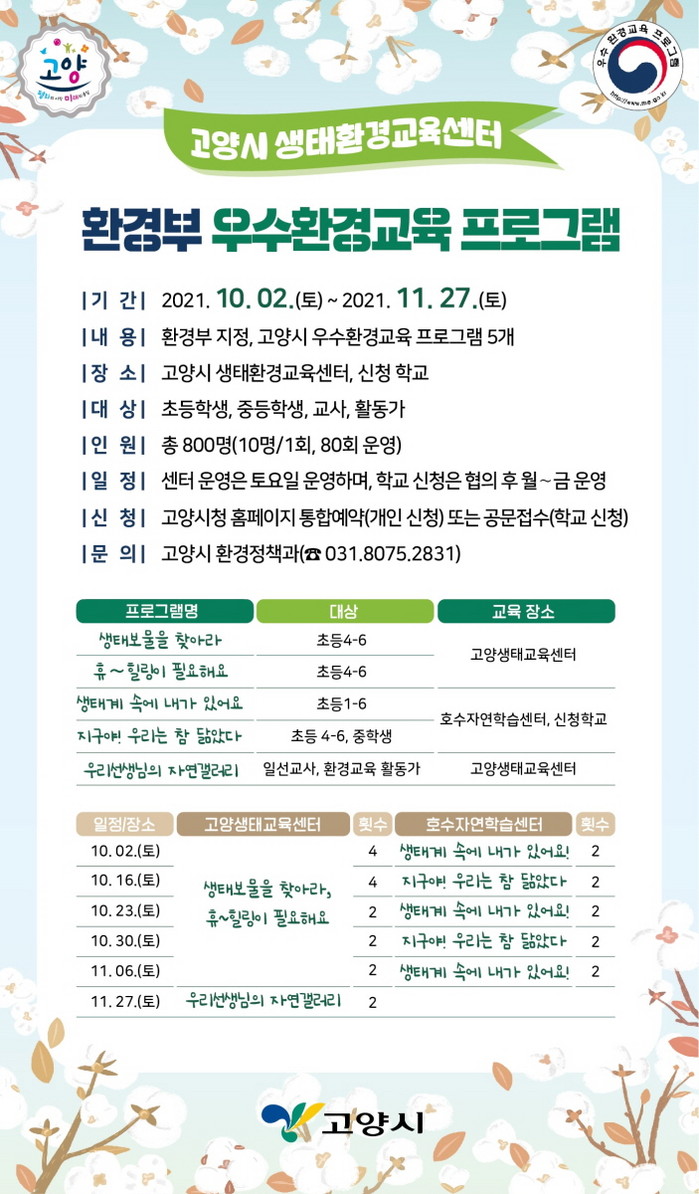 [부자동네타임즈 김인수기자] 고양시 생태환경교육센터가 환경부 지정 우수 환경교육프로그램을 10월 2일(토)부터 11월 27일(토)까지 운영한다.