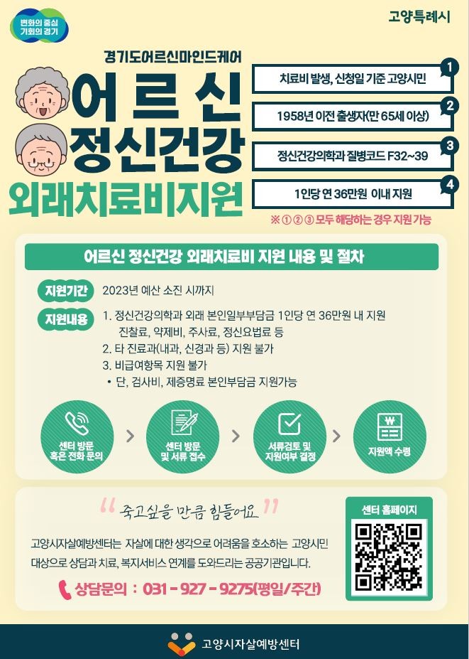 ‘어르신마인드케어’ 사업은 ▲질병코드 에프(F)32~39로 진단받고 ▲2023년 기준 65세 이상(1958년 포함) 이상이며 ▲치료비 발생일 및 신청일 기준으로 고양시에 거주 중인 어르신에게 정신건강의학과 외래 본인일부부담금을 1인당 연 36만원을 지원하는 사업이다.