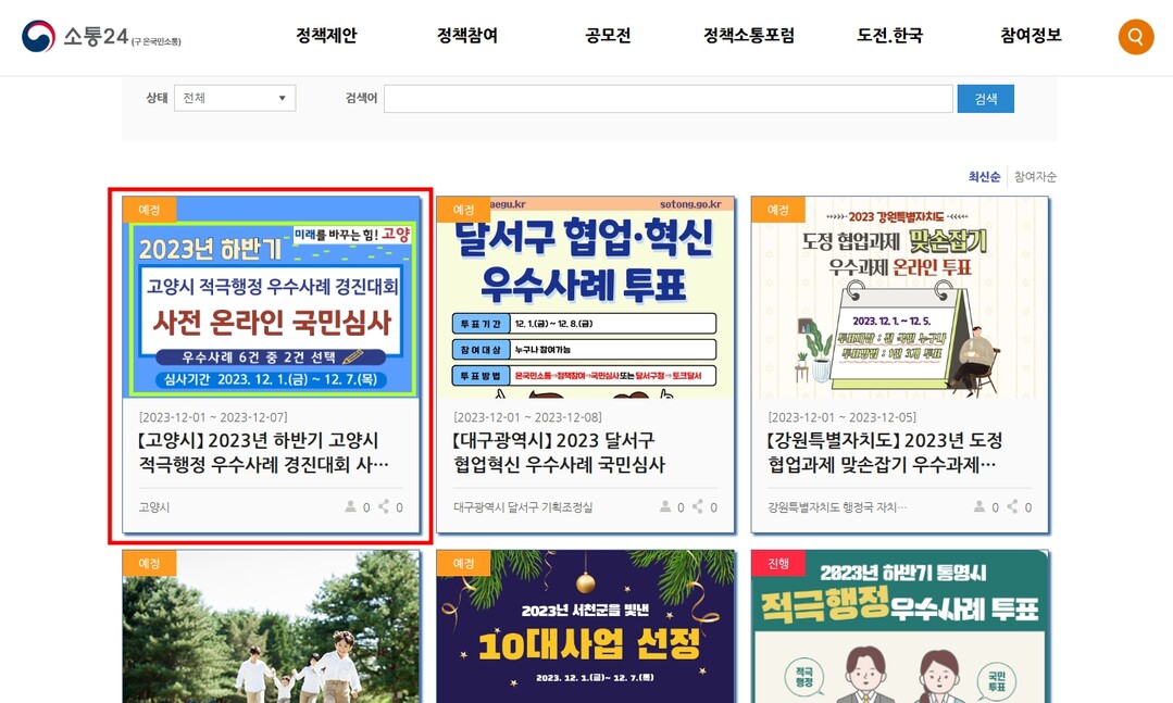 사전 온라인 국민심사는 ‘소통24(구 온국민소통)’ 누리집(sotong.go.kr, 회원가입 또는 소셜네트워크서비스(SNS) 간편 로그인 필수)의 국민심사 코너에서 12월 7일까지 진행한다.