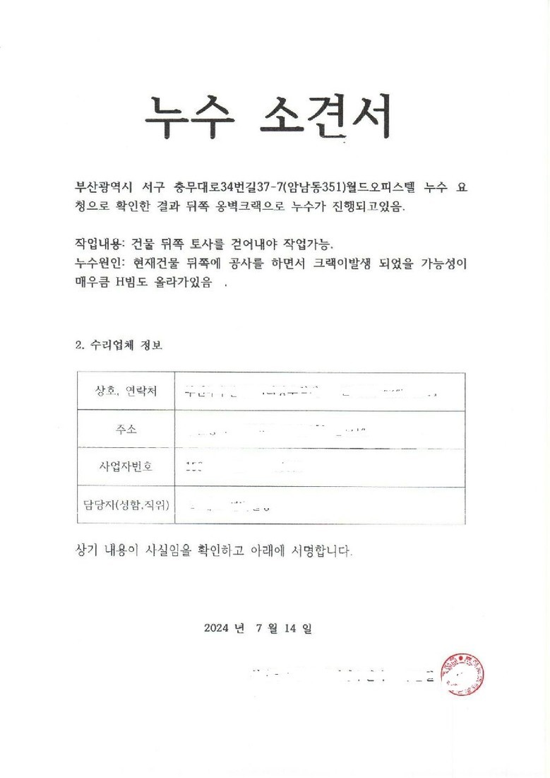 부산광역시 서구 암남동 소재 월드오피스텔 지하실에 '심각한 누수와 곰팡이′의 발생 때문에 전문업체의 확인한 결과 뒤쪽 옆 건물 신축 공사현장 방향 옹벽크랙으로 누수가 진행되고 있는 것으로 알려져 지하실 입주민이 반발하고 나섰다.