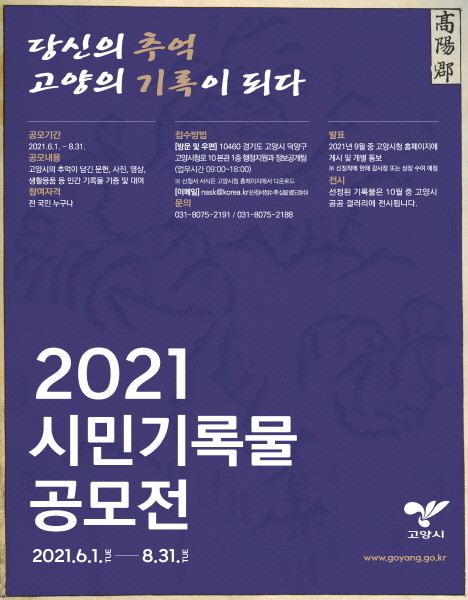 [부자동네타임즈 김인수기자] 고양시는‘고양시민과 함께했던 30년, 미래를 열어 갈 40년’이라는 주제로 2021 시민기록물 공모전을 10월중 개최할 예정이다.