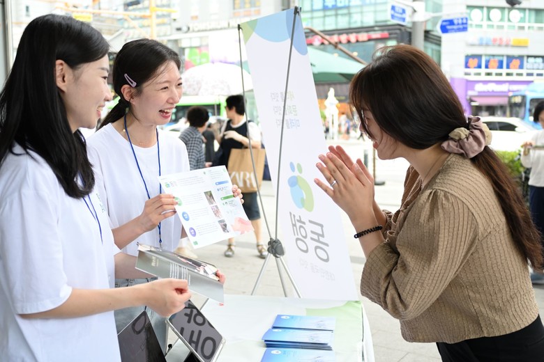 | ▲지난 7일 영등포역 부근에서 열린 동행 캠페인 홍보부스에서 HWPL 글로벌 08지부 봉사자가 시민에게 캠페인에 대해 설명하고 있다. [사진 제공 = HWPL 글로벌 08지부] |
