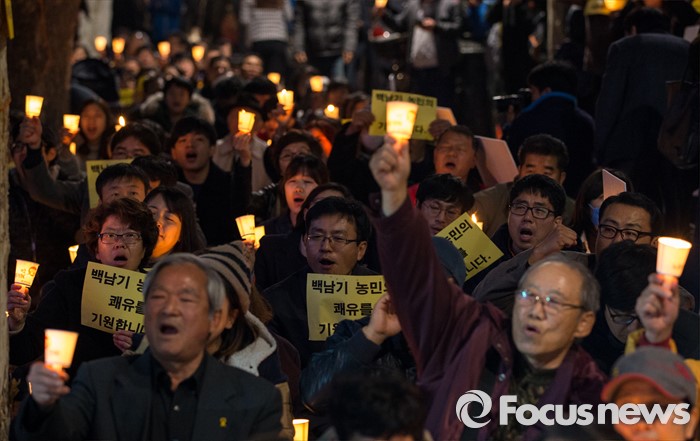 (서울=포커스뉴스) 17일 오후 서울 종로구 대학로 서울대학교병원 후문 앞에서 열린 '살인폭력집압 경찰청장 파면 및 백남기 농민 쾌유 기원 촛뷸문화제'에 참석한 시민들이 구호를 외치고 있다.