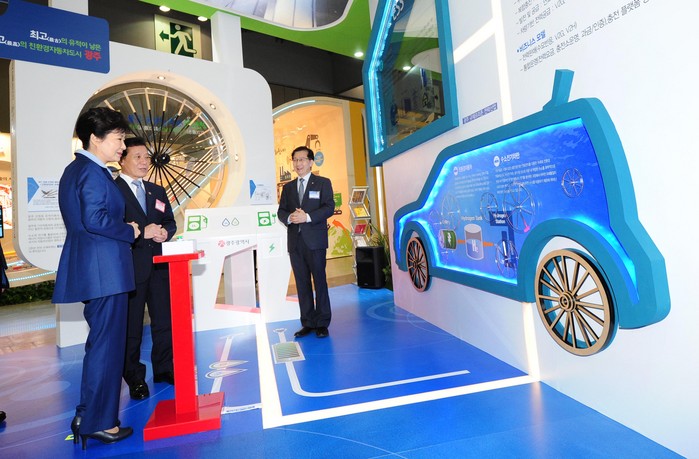광주시 전시관을 찾은 박 대통령은 수소융합스테이션과 에너지저장시스템을 활용해 2000년 전 수레바퀴와 친환경자동차 바퀴가 회전하고, 지진과 자연재해 등 위급상황에서는 가정용 전기로 사용되는 모습을 직접 시연했다.