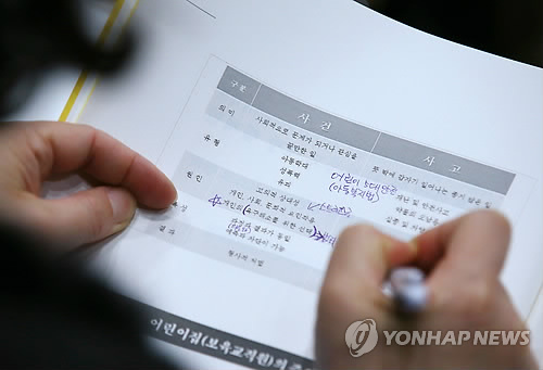 | △ 강연 내용 필기하는 선생님 (서울=연합뉴스) 김도훈 기자 = 29일 오후 서울시청 신청사 다목적홀에서 열린 2015 서울시국공립어린이집 아동학대 및 안전사고 예방 캠페인에 참석한 보육교사가 유인물에 강연 내용을 필기하고 있다. 이번 교육에는 아동 학대의 기준 및 처방법은 물론 보육교사들의 열악한 근무환경에서 오는 스트레스 진단 및 관리 방법도 포함돼 있다. 2015.1.29 superdoo82@yna.co.kr |