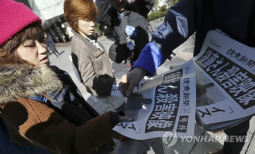 | △ 8일 만에 또… (AP=연합뉴스) 1일(현지시간) 일본 도쿄 거리에서 시민들이 호외로 발행된 '고토(後藤)씨 살해 영상' 제목의 신문 1면 머리기사를 읽고 있다. 이슬람국가(IS)는 한국시간으로 이날 오전 5시께 고토 겐지(47)를 살해했음을 보여주는 영상을 인터넷에 올렸다. 지난달 24일 다른 일본인 인질 유카와 하루나를 참수했다고 밝힌 지 8일 만이다. bulls@yna.co.kr |