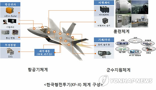 | △ 방사청, 한국형 전투기 개발사업 입찰공고 (서울=연합뉴스) 방위사업청은 19일 한국형 전투기(KF-X) 체계개발 사업에 대한 입찰공고를 했다고 밝혔다. 총사업비 8조 6천여억 원이 투입되는 KF-X 사업은 공군의 노후전투기인 F-4, F-5의 도태에 따른 전력 보충과 미래 전장운영 개념에 맞는 성능을 갖춘 전투기를 연구개발하는 사업이다. 사진은 한국형전투기 체계 구성도. 2014.12.19 << 방위사업청 제공 >> photo@yna.co.kr |