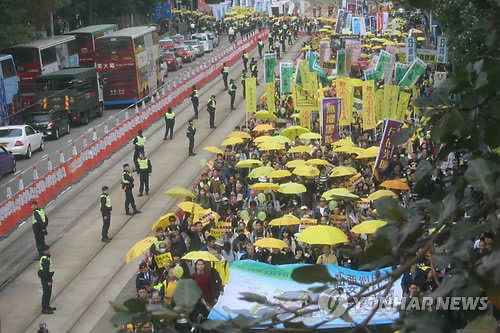 시민들은 민주화 운동의 상징인 노란 우산과 렁춘잉(梁振英) 행정장관(행정수반)을 조롱하는 그림이 그려진 대형 플래카드 등을 앞세운 채 행진에 나섰다.