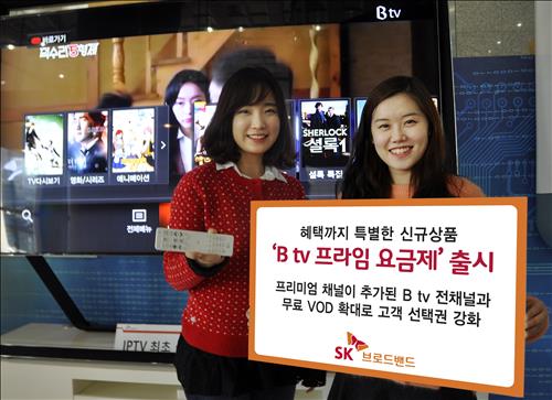 (서울=연합뉴스) 박창욱 기자 = SK브로드밴드는 기존 B tv 표준형 상품에 고객선호 채널 15개를 추가한 `B tv 프라임'을 2일부터 선보인다고 밝혔다.