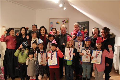 | △ 독일 종이문화재단 프랑크푸르트지부에서 열린 종이접기급수 수료식에서 급수증과 메달을 받은 어린이들과 참석자들이 함께 '조이'(종이)을 외치고 있다.<<종이문화재단 제공>> |