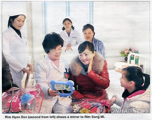 | △ '8년 수술'로 얼굴 되찾은 북한 여성 노동자 (서울=연합뉴스) 북한의 주간 영자신문 '평양타임스' 1월 24일 자는 2006년 평안북도 대관군의 공장 화재로 얼굴에 심각한 화상을 당한 여성 노동자 림송미(28)가 8년에 걸친 성형수술로 외모를 회복한 이야기를 대서특필했다. 평양타임스는 림송미가 자신을 치료해준 조선적십자종합병원 림현단 과장과 함께 거울을 들여다보며 미소짓는 모습이 담긴 사진도 게재했다. |