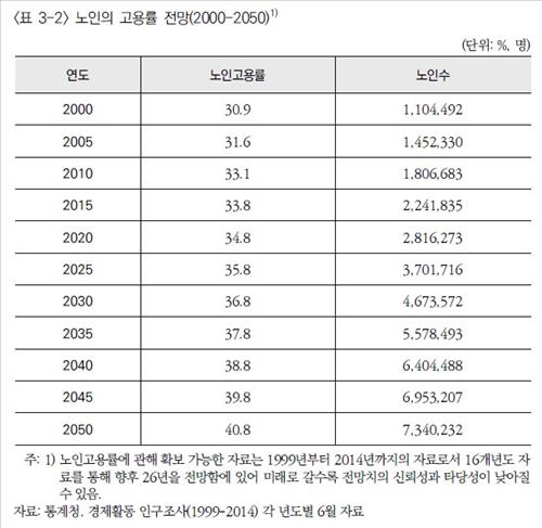 급속한 노령화로 인해 2010년 181만명이던 경제활동 참여 노인 수는 2030년 467만명, 2040년 640만명, 2050년 734만명으로 증가할 것으로 예상된다.
