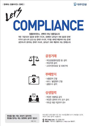 (서울=연합뉴스) 서미숙 기자 = 대우건설[047040]이 사내 준법경영 추진을 위해 자율적 준법감시 시스템 '컴플라이언스 프로그램'을 도입, 시행에 들어갔다고 3일 밝혔다.