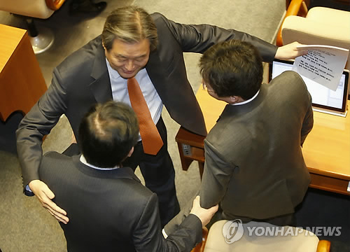 | △ 포옹하는 김무성 대표 (서울=연합뉴스) 이상학 기자 = 새누리당 김무성 대표(가운데)가 3일 오전 국회 본회의에서 유승민 원내대표(오른쪽), 최경환 기획재정부 장관을 포옹 하고 있다. 2015.2.3 leesh@yna.co.kr |