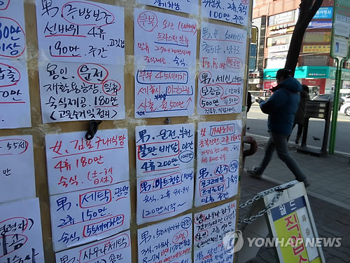 | △ 중국동포 구하는 광고 전단 (서울=연합뉴스) 차대운 기자 = 서울 대림역 인근 중국동포 거리의 한 직업소개소 앞에서 중국동포를 구하는 일자리 광고가 빽빽히 붙어 있다. 2015.2.4 cha@yna.co.kr |