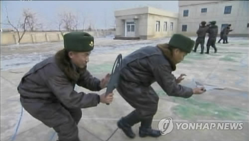 | △ 북한 공군의 '도보비행훈련' (서울=연합뉴스) 북한 공군 전투기 조종사들이 모형 전투기를 들고 지상에서 '도보비행훈련'을 하고 있다. 조선중앙TV는 도보비행훈련 영상이 담긴 기록영화를 지난 달에 방영했다. 북한 항공 및 반항공군 대변인은 4일 남한 언론이 최근 이 훈련을 '장난감 전투기 훈련'이라고 폄하한 데 대해 '미친개'라는 거친 말까지 써가며 원색적으로 비난했다. 2015.2.4 nkphoto@yna.co.kr |