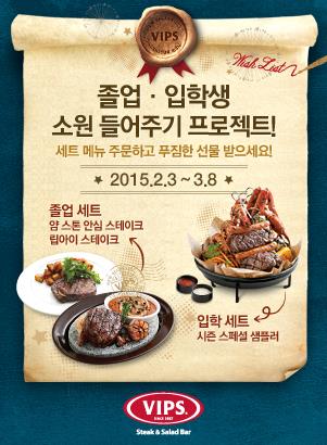(서울=연합뉴스) 신호경 기자 = 스테이크 하우스 빕스(VIPS·www.ivips.co.kr)가 다음 달 8일까지 추첨을 통해 졸업·입학생들에게 노트북, 태블릿PC 등을 증정하는 '소원 들어주기' 행사를 진행한다.