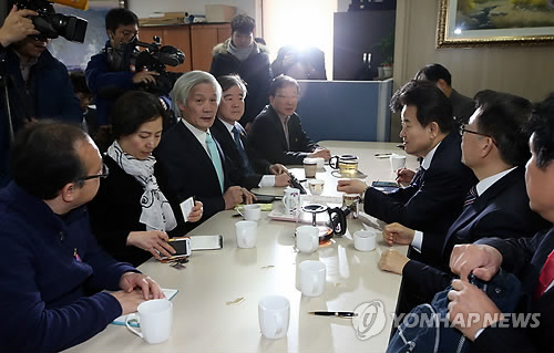| △ 정동영-국민모임 회동 (서울=연합뉴스) 박동주 기자 = 새정치민주연합에서 탈당한 정동영 전 의원이 국민모임과 4·29 보궐선거 전략 등을 논의하기 위해 4일 오전 서울 여의도에서 회동, 참석자들과 대화를 나누고 있다. |