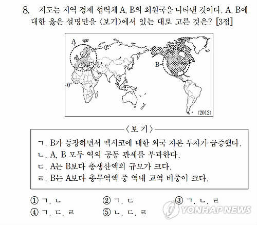 | △ 2014학년도 대학수학능력시험 세계지리 8번 문항 (연합뉴스 자료사진) |