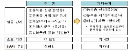 지금까지 장애인등록증 발급은 여러 배송단계를 거쳐야 해 발급기간이 약 15일 정도로 길고 장애인이 주민센터를 방문하거나 등기비용을 부담해야 하는 불편이 있었다.