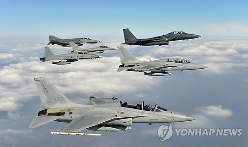 | △ 공군, '소어링 이글 훈련' 실시 (서울=연합뉴스) 5일 청주시 17전투비행단 공군기지 등에서 진행된 전역급 종합전투훈련인 '소어링 이글(Soaring Eagle) 훈련'에서 전투기들이 편대 비행을 하고 있다. |