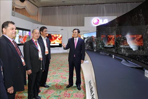 | △ LG전자가 4일~5일(현지시간) 말레이시아에서 아시아 지역 15개국의 주요 거래선 및 기자 등 400여명을 초청해 지역밀착형 전략제품 발표회‘LG이노페스트 2015'를 개최했다. 사진은 현지 거래선에게 LG 올레드 TV 등 주요 전략 제품을 설명하고 있는 아시아지역대표 이호 부사장(오른쪽) |