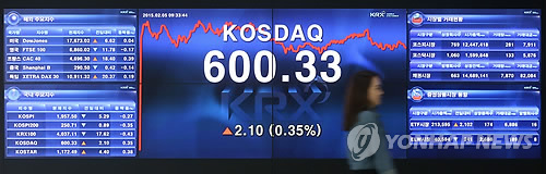 | △ 코스닥 600선 돌파 (서울=연합뉴스) 김도훈 기자 = 코스닥이 600선을 돌파한 5일 오전 서울 여의도 한국거래소 대형스크린 앞을 직원이 지나고 있다. 코스닥이 600선을 넘은 것은 지난 2008년 6월 26일(602.74) 이후 처음이다. superdoo82@yna.co.kr |