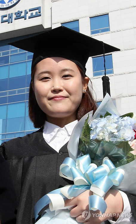 | △ 좌절 딛고 일어선 오뚝이 (구미=연합뉴스) 여러 어려움을 딛고 6일 구미대 졸업식에서 수석졸업해 재단 이사장상을 받은 정예림(27·작업치료과)씨. 2015.2.6 << 구미대 >> sds123@yna.co.kr |