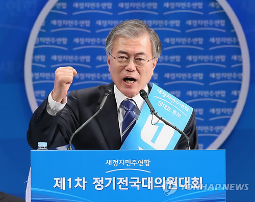 | △ 당선자 수락연설하는 문재인 (서울=연합뉴스) 진성철 기자 = 새정치민주연합 새 당대표에 선출된 문재인 의원이 8일 서울 송파구 올림픽체조경기장에서 열린 새정치민주연합 제1차 정기전국대의원대회에서 당선자 수락연설을 하고 있다. 2015.2.8 zjin@yna.co.kr |