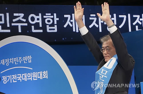 | △ 인사하는 새정치민주연합 문재인 대표 (서울=연합뉴스) 이상학 기자 = 새정치민주연합 새 당대표에 선출된 문재인 의원이 8일 서울 송파구 올림픽체조경기장에서 열린 제1차 정기전국대의원대회에서 수락 연설을 마친 뒤 손을 들어 인사를 하고 있다. 2015.2.8 leesh@yna.co.kr |