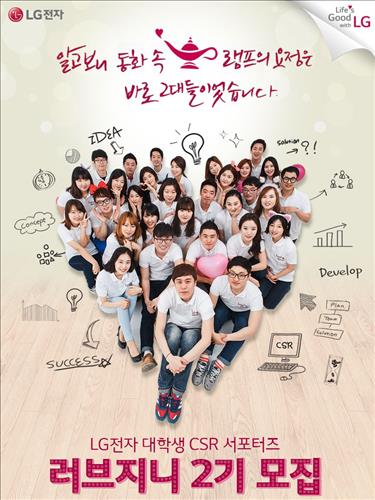 (서울=연합뉴스) 박대한 기자 = LG전자[066570]는 대학생 CSR(Corporate Social Responsibility, 기업의 사회적 책임) 서포터스 프로그램인 '러브지니(Love Genie)' 2기 참여자 30명을 모집한다고 9일 밝혔다.