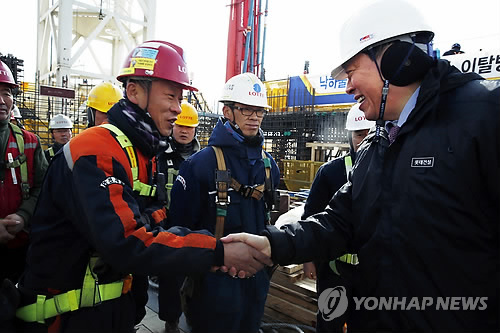 | △ 신동빈 롯데 회장, 롯데월드타워 공사 현장 방문 (서울=연합뉴스) 신동빈 롯데그룹 회장(오른쪽)이 9일 오후 롯데월드타워 97층 공사 현장을 방문, 근로자들을 격려하고 안전시공을 당부하고 있다. (롯데그룹 제공) |