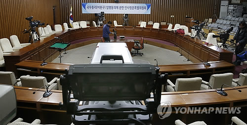 | △ 인사청문회 방송 준비 (서울=연합뉴스) 이상학 기자 = 이완구 국무총리 후보자에 대한 국회 인사청문회가 오는 10일부터 이틀간 열린다. 9일 국회에 마련된 청문회장에서 방송사 관계자들이 관련 준비를 하고 있다. |