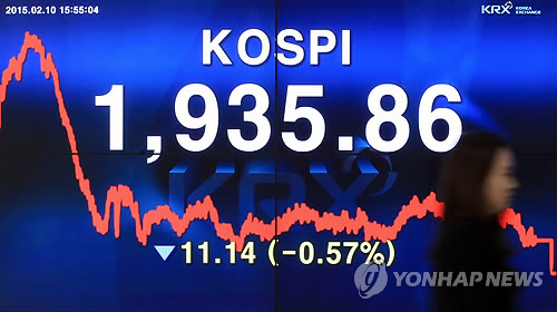 | △ 연이은 대외 악재에 코스피 하락 (서울=연합뉴스) 홍해인 기자 = 그리스 불안, 달러 강세, 유가 변동성 확대 등 대외 악재가 이어지며 10일 코스피 지수가 하락했다. 코스피는 전날보다 11.14포인트(0.57%) 하락한 1,935.86으로 거래를 마쳤다. 이날 오후 서울 여의도 한국거래소 홍보관. |