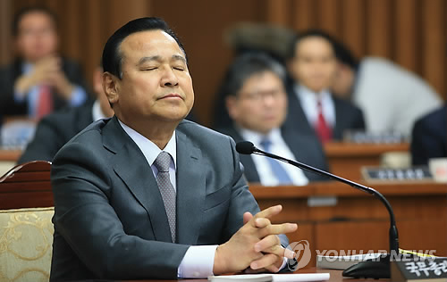 | △ 녹취록 공방, 눈 감은 총리 후보자 (서울=연합뉴스) 홍해인 기자 = 이완구 총리 후보자가 10일 오후 서울 여의도 국회에서 열린 인사청문회에서 여야 의원들간 최근 기자들과 이 후보자가 사석에서 주고받은 대화 내용이 담긴 녹취록 음성 파일 공개 여부에 대한 공방이 오가자 눈을 감은 채 두 손을 모아 앉아 있다. |