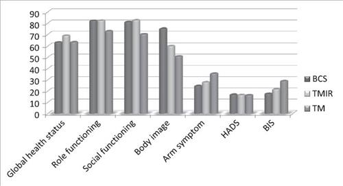 | △ 여기서 BCS는 유방보존수술, TMIR은 유방전절제와 동시 복원수술, TM은 유방전절제수술을 의미. 삶의 질 항목 중 role functioning, social functioning, body image, arm symptom, BIS가 BCS나 TMIR에서 좋고 TM에서 나쁜 것을 볼 수 있음. Role fx, Social fx, body image는 값이 클수록 좋은 것이고, Arm symptom, BIS는 값이 클수록 나쁜 것임. |