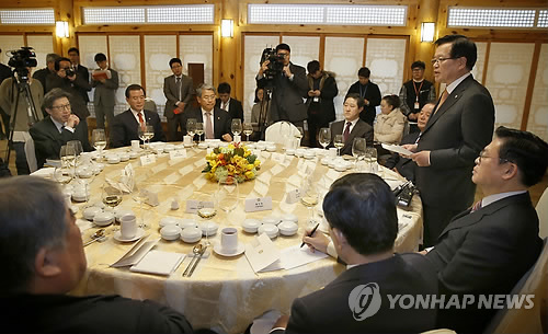 | △ 국회 의장단, 상임위원장단 오찬 간담회 (서울=연합뉴스) 이상학 기자 = 정의화 국회의장이 11일 국회 사랑재에서 열린 의장단, 상임위원장단 오찬간담회에서 인사말을 하고 있다. |