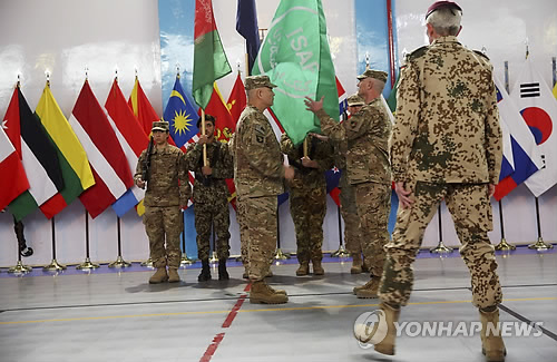 | △ 미국이 지난해 12월 28일(현지시간) 미 역사상 최장기 전쟁인 아프가니스탄 전쟁에 공식으로 종지부를 찍었다. 사진은 아프간 주둔 북대서양조약기구(나토) 국제안보지원군(ISAF) 사령관 존 캠벨 미 육군 대장(가운데)이 이날 수도 카불의 주둔지 부대에서 실시된 전쟁 종식 행사에서 'ISAF 깃발'을 13년 만에 내리고 있는 모습. (AP=연합뉴스) |