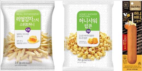 12일 편의점 씨유(CU)에 따르면 지난달 출시한 '리얼감자 스위트허니'(1천500원)와 '허니샤워팝콘'(1천원)이 출시 한 달도 안 돼 2월 초 팝콘·감자스낵 판매순위에서 각각 2위·3위에 올랐다. 두 제품 모두 꿀과 버터 맛이 어우러진 스낵이다.