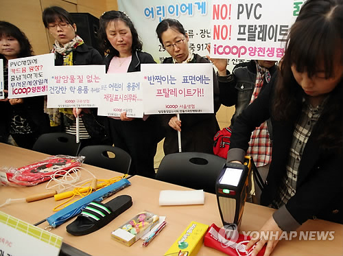 | △ '발암물질 없는 사회 만들기 국민행동' 회원들이 환경재단에서 휴대용 X선 형광분석기를 이용한 어린이 문구류 중금속 검색 시연을 하고 있다. (연합뉴스 자료사진) |