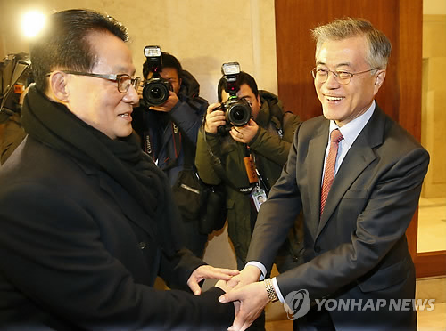 | △ 인사하는 문재인 박지원 (서울=연합뉴스) 이상학 기자 = 새정치민주연합 문재인 대표와 박지원 의원이 13일 오후 서울 마포 가든호텔에서 만나 인사를 하고 있다. 2015.2.13 leesh@yna.co.kr |