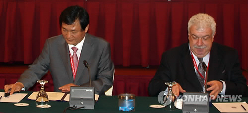 | △ OANA 이사회 11월 서울서 개최…연합뉴스 주최 (쿠알라룸푸르=연합뉴스) 김권용 특파원 = 말레이시아의 쿠알라룸푸르 이스타나호텔에서 14일 개막한 제38회 아태뉴스통신사기구(OANA) 이사회에 참석한 연합뉴스 오재석 상무(왼쪽)와 미하일 구스만 러시아 타스통신 수석부사장 겸 OANA 사무총장이 차기 이사회의 서울 개최에 관한 합의서에 서명하고 있다. 2015.2.14 kky@yna.co.kr |