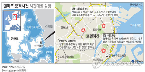 | △ <그래픽> 덴마크 총격사건 시간대별 상황 (서울=연합뉴스) 반종빈 기자 = 덴마크 경찰은 15일(현지시간) 오전 코펜하겐 시내에서 경찰에 총을 쐈다가 사살된 남성이 앞서 발생한 두 차례 총격 사건의 용의자로 보인다고 15일(현지시간) 밝혔다. 14~15일 코펜하겐 시내에 발생한 총 세 차례의 총격 사건으로 용의자 추정 남성을 포함해 모두 3명이 숨지고 5명이 다쳤다. bjbin@yna.co.kr 페이스북 tuney.kr/LeYN1 트위터 @yonhap_graphics |