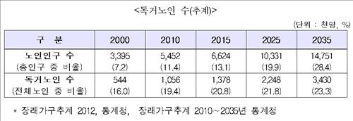독거노인은 전국적으로 138만명으로 추정되며, 이는 2000년의 54만명보다 2.5배 가량 많다. 통계청 장래가구추계에 따르면 독거노인은 2035년에는 다시 현재의 2.5배 수준인 343만명으로 늘어날 전망이다.
