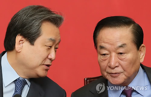 | △ 김무성 서청원 대화 (서울=연합뉴스) 진성철 기자 = 새누리당 김무성 대표(왼쪽)와 서청원 최고위원이 16일 국회에서 열린 최고위원회의에서 대화하고 있다. |