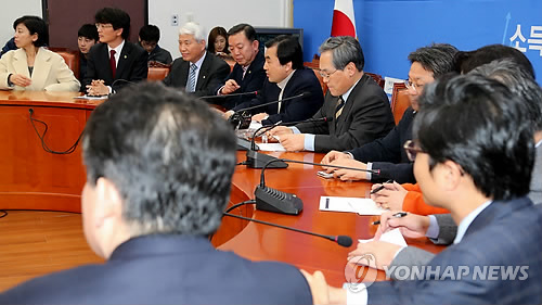 | △ (서울=연합뉴스) 새정치민주연합 우윤근 원내대표 등 원내지도부가 지난 15일 국회 원내대표실에서 이완구 총리후보자 임명동의안을 어떻게 처리할 것인가를 논의하는 원내대책회의를 하고 있다. |